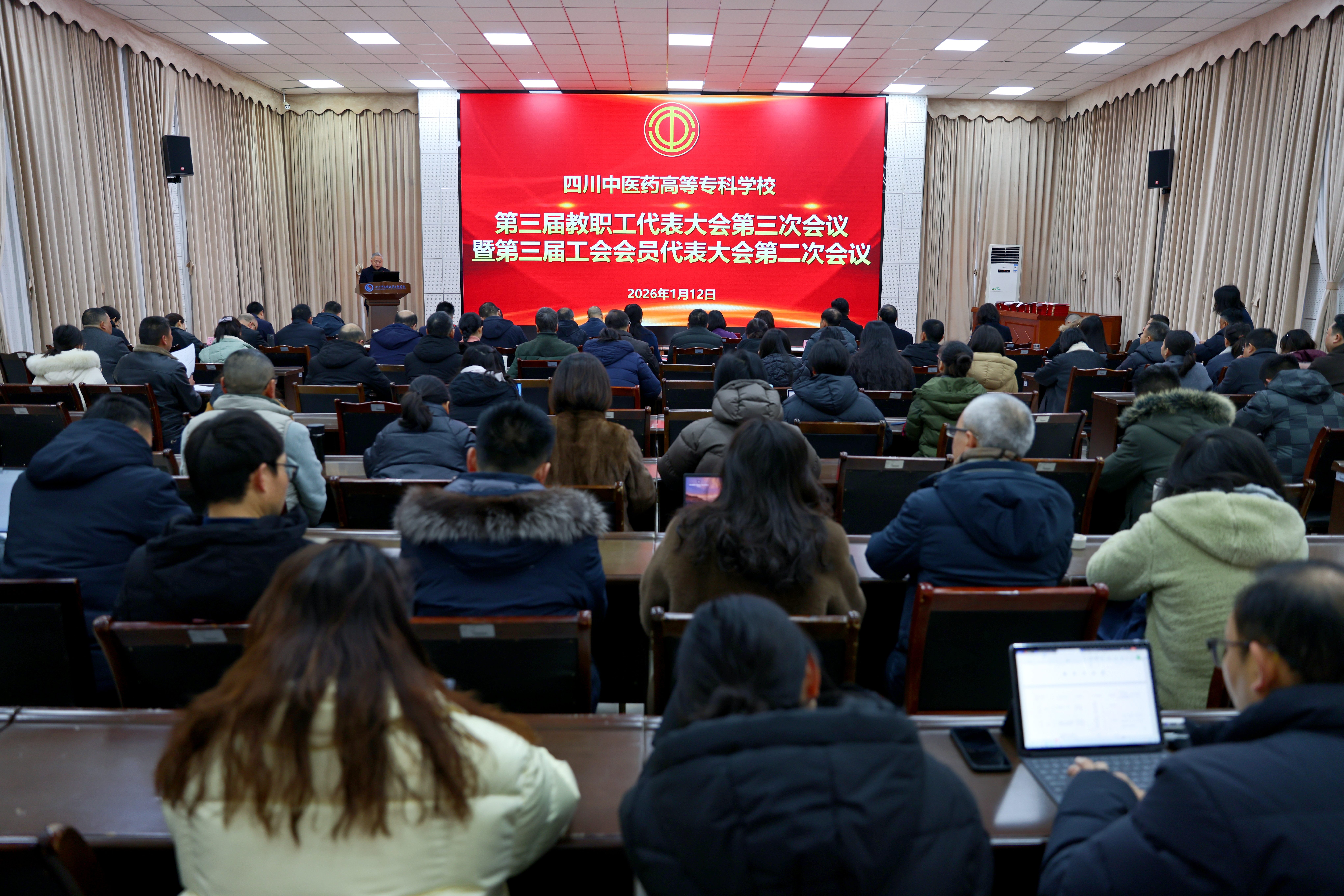 2026年1月12日上午,学校第三届教职工代表大会第三次会议暨第三届工会会员代表大会第二次会议在南园综合楼五楼学术厅举行。校党委委员、纪委书记李文虎主持会议。学校“双代会”正式代表及2025年度工会工作先进个人获奖人员参加了会议。